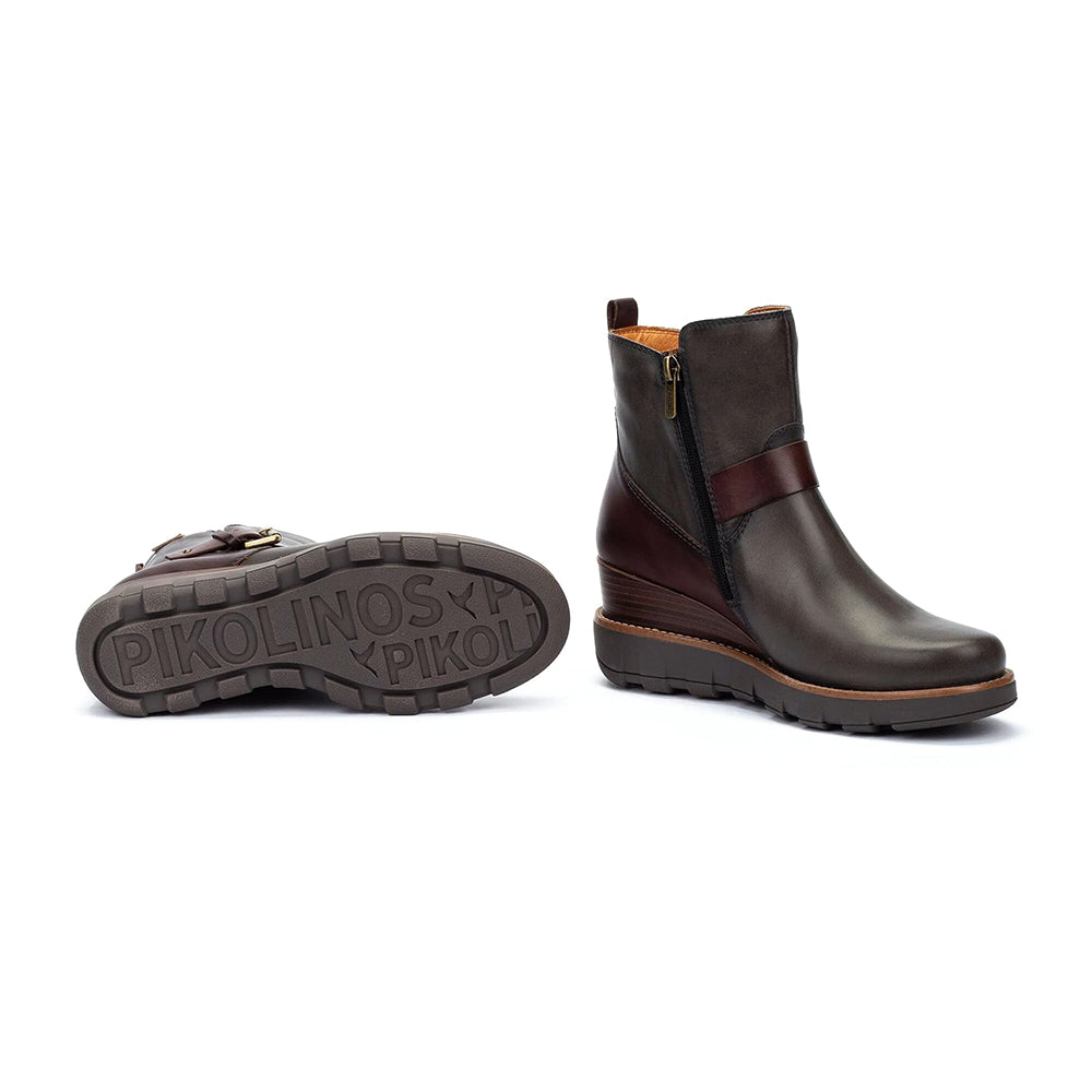 Modern ankle boot with a sleek leather finish and wraparound buckle accent. Side zipper for easy wear and a cushioned insole for all-day comfort. Subtle wedge heel and durable treaded sole add lift and traction for versatile, everyday style.