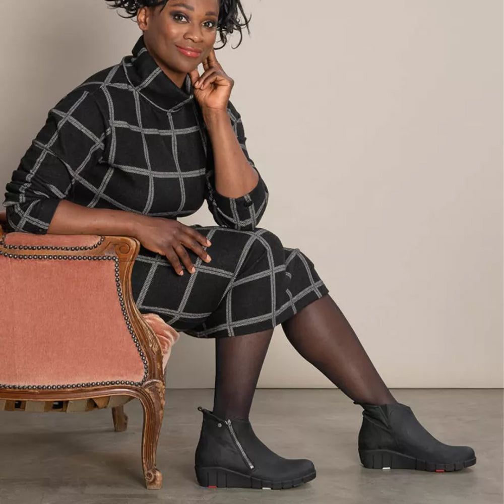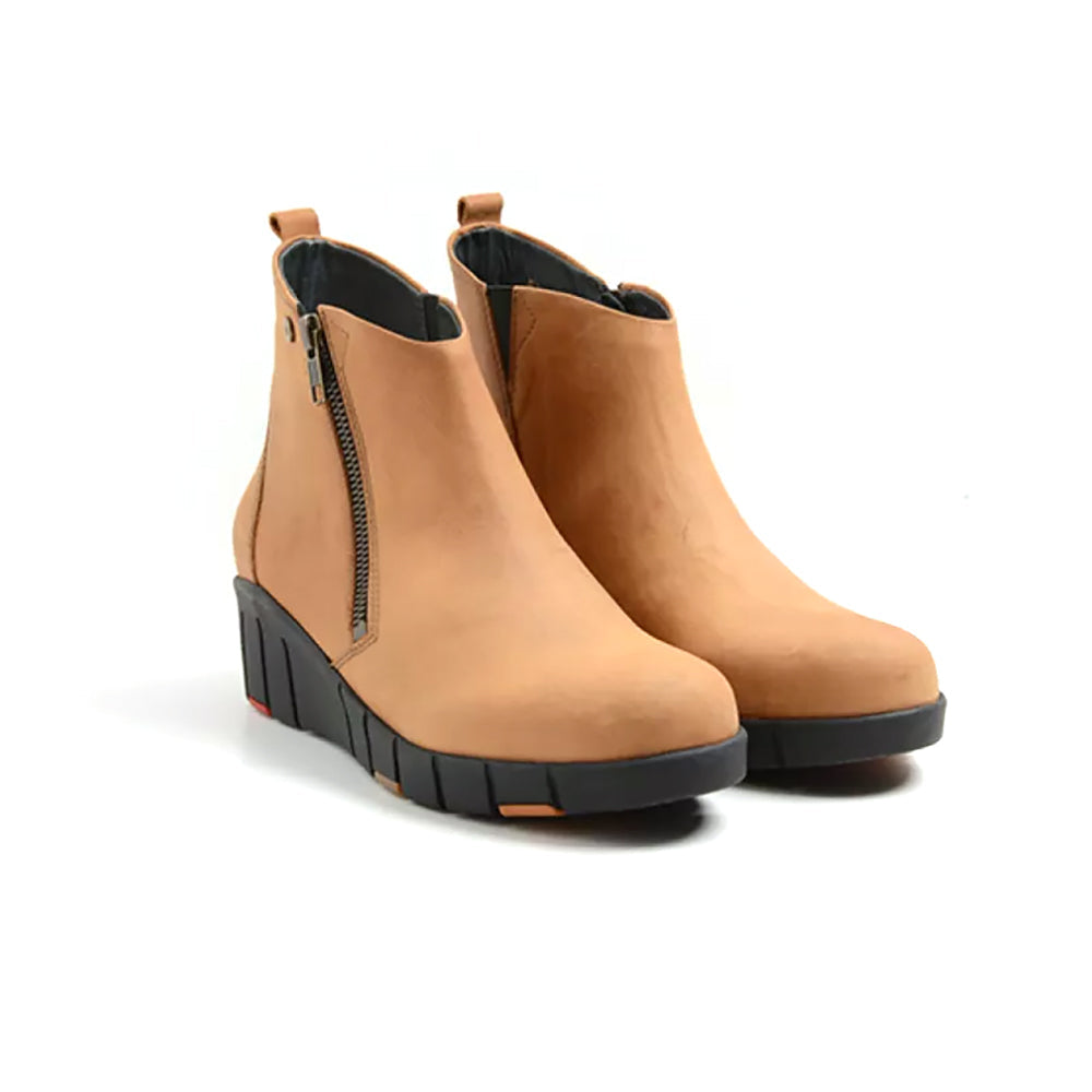 The Wolky Phoenix ankle boot is constructed from a greased nubuck and 100% leather lining. An outside zipper and thick sole make for easy and functional comfort. With this stunning boot, you benefit from the extra height in the wedge while maintaining superior comfort due to the platform on the forefoot. Pair with skinny jeans for an easy everyday outfit.